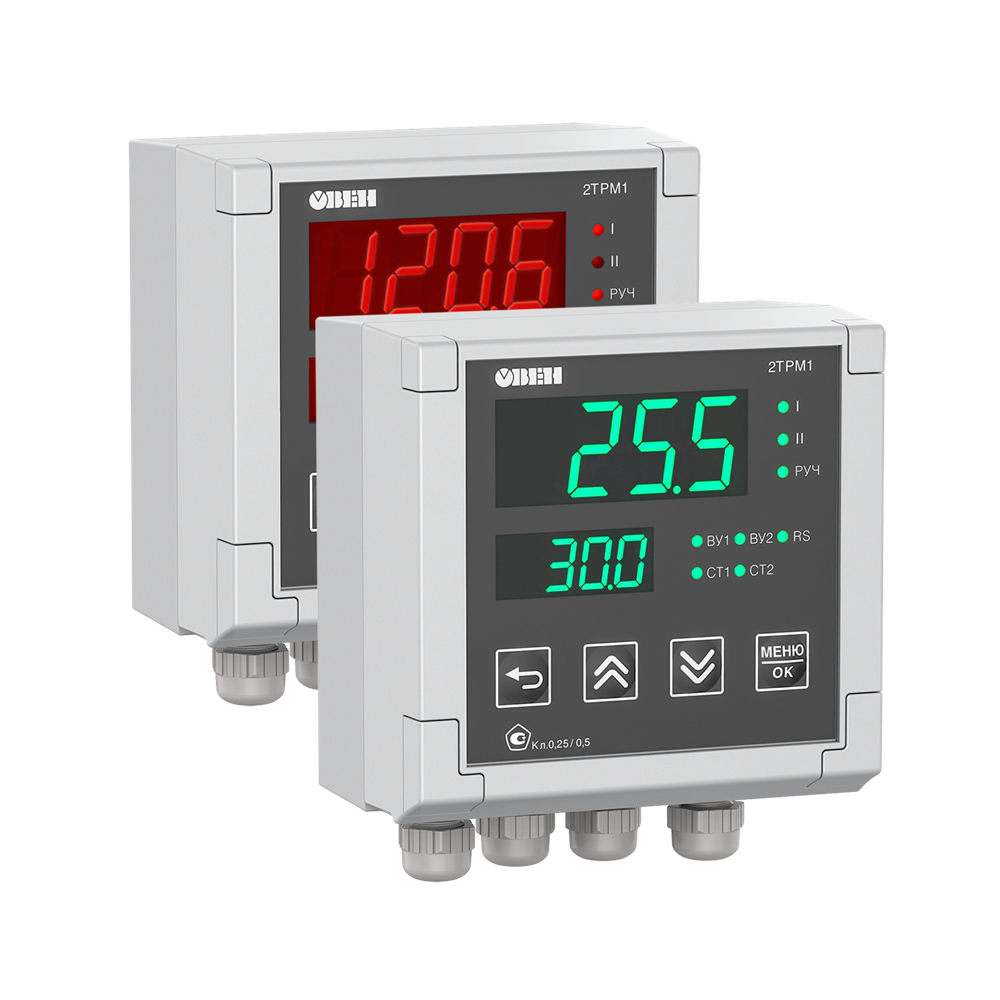 2ТРМ1 – двухканальный цифровой терморегулятор, предназначенный для измерения, регистрации или автоматического регулирования температуры, а также других физических величин (давление, влажность, уровень, расход и т.д.). Отличительной особенностью прибора является наличие двух независимых каналов управления. Прибор осуществляет как независимое управление по двум каналам, так и совместную работу каналов в задачах регулирования и сигнализации. Наличие второго входа позволяет выполнять регулирование по двум величинам с вычислением среднего значения или разницы показаний входов. Двухканальный терморегулятор 2ТРМ1 работает с разными типами датчиков что позволяет одним прибором контролировать две физические величины, например температуру и давление, температуру и влажность, давление и уровень. Наличие RS-485 позволяет выводить все измеряемые и настраиваемые параметры прибора в сеть диспетчеризации предприятия.